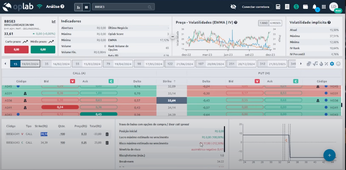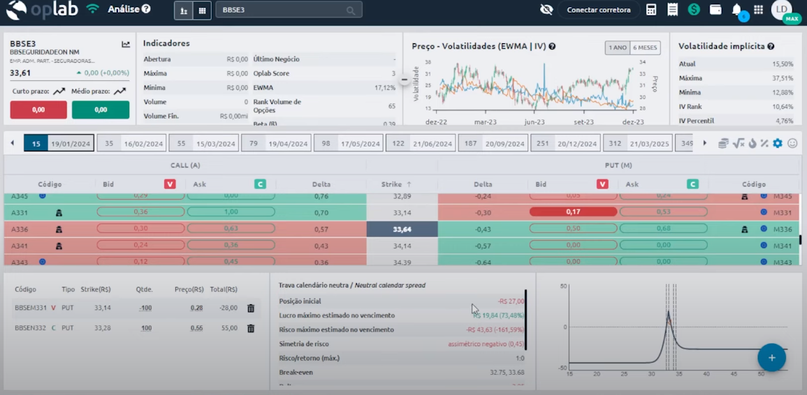 No exemplo abaixo, montei essa estratégia de calendário com BBSE3.