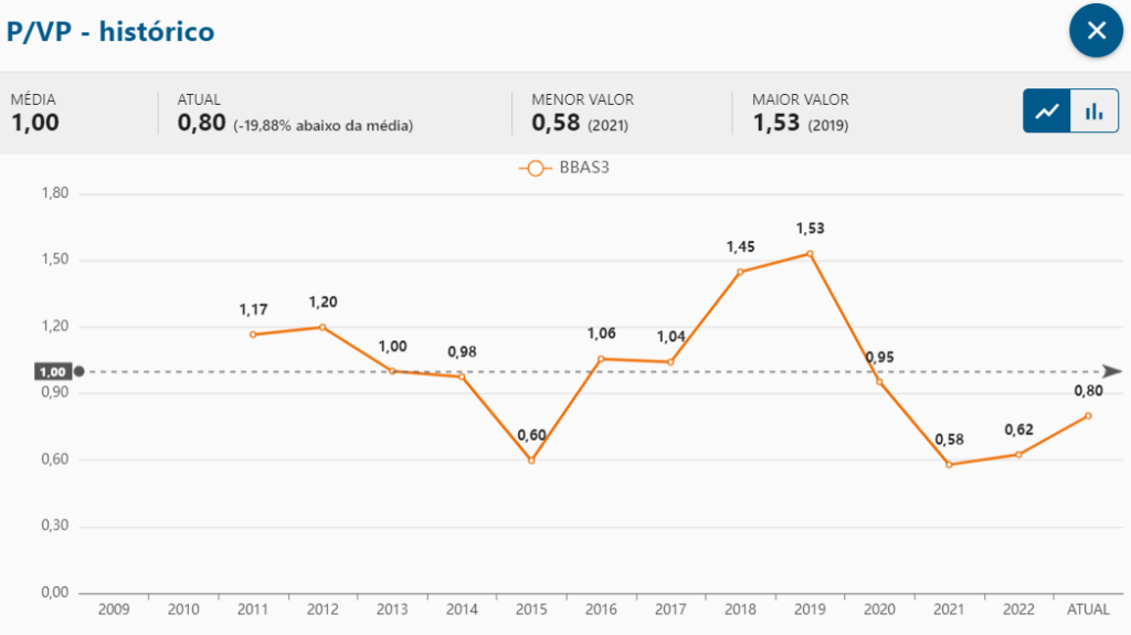 Eu gosto de analisar quantas vezes o preço da ação está sendo negociado em comparação com o patrimônio líquido.