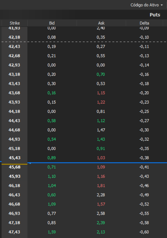 Caso queira trabalhar, ainda assim, com baixa probabilidade de ter de comprar o ativo, posso escolher uma opção que tenha o delta entre 0,15 e 0,20.