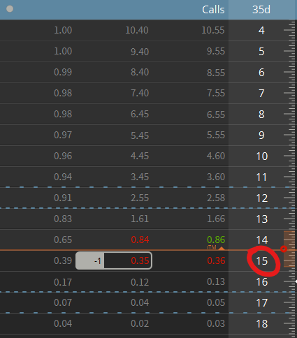 Nesse exemplo, recebi $0.35 pela obrigação de ter que vender o ativo a $15 em até 35 dias.