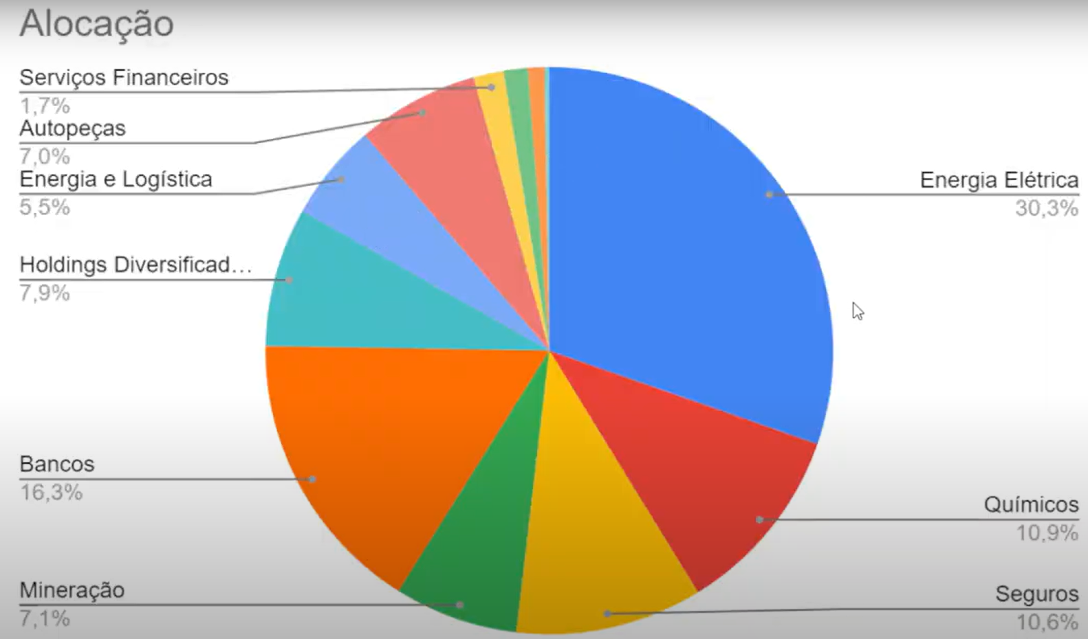 Podemos notar também uma excelente diversificação de ativos, sendo que a maior parte do capital está no setor de energia elétrica e bancos, alinhado com o objetivo do cliente em gerar renda passiva.