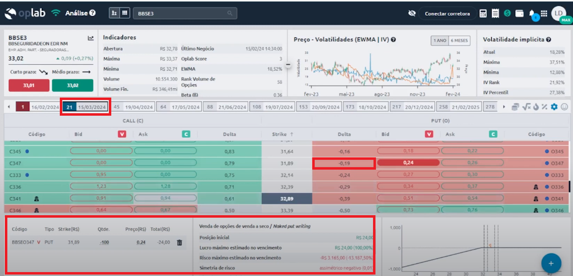 Vamos analisar a renda obtida com a venda de PUT de BBSE3 com vencimento para 21 dias, delta próximo a 0,20 e volatilidade implícita igual a 18,28%.