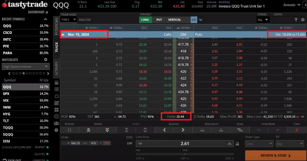 Fazendo a venda de PUT com essa opção, receberíamos US$2,61 em troca da obrigação de comprar o ativo a US$416.