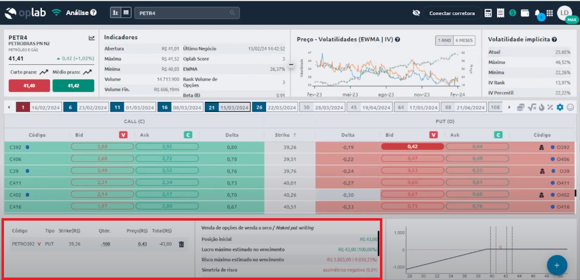 Nesse caso, receberíamos R$0,24 em troca da obrigação de comprar o ativo por R$31,89.