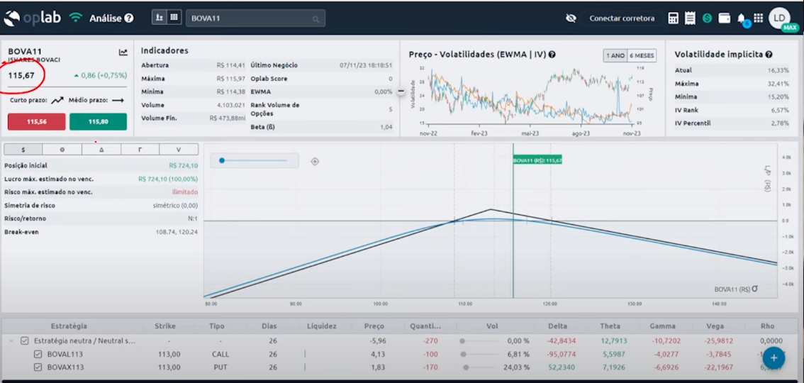 Vamos supor que montamos a nossa estrutura de straddle vendido quanto o ativo estava a R$ 113, e o mercado subiu para R$ 115.