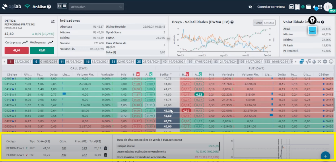 Vamos montar uma venda de PUT com PETR4 com strike de R$42,25.