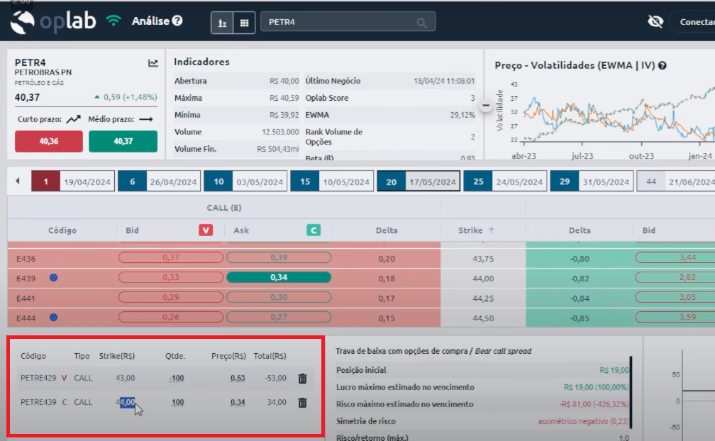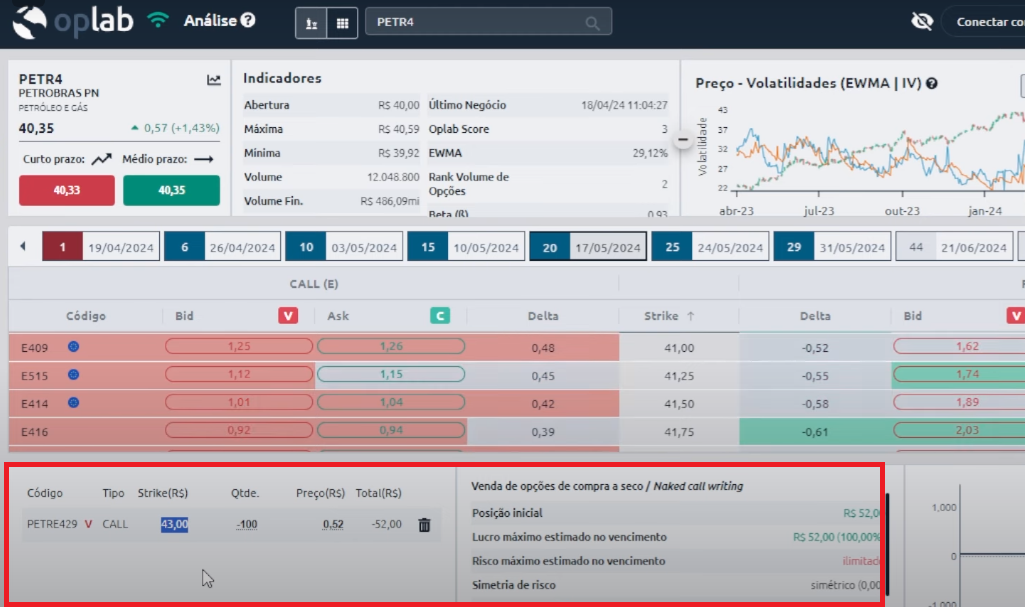 Nesse exemplo com PETR4, nós receberíamos uma taxa de R$52 em troca da obrigação de ter que vender o ativo a R$43 se o mercado subisse acima desse valor.