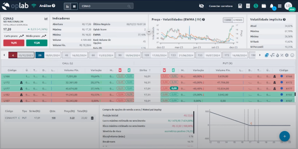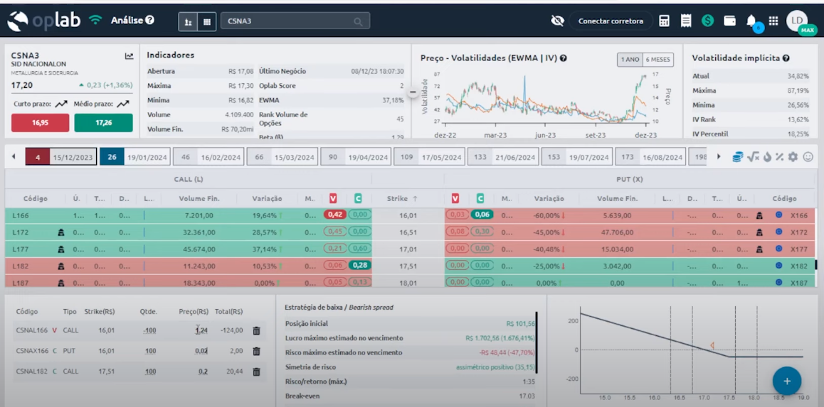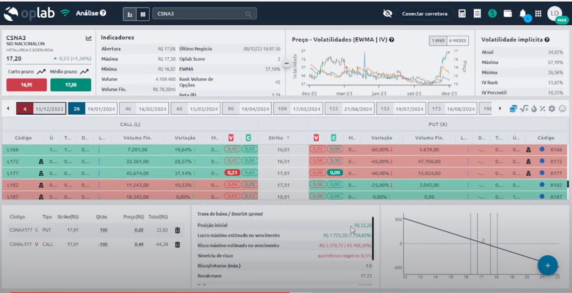 Vamos utilizar como exemplo o ativo CSNA3, que passou recentemente por uma alta e está cotado a R$ 17,20.