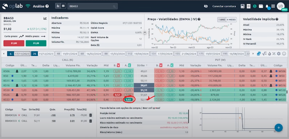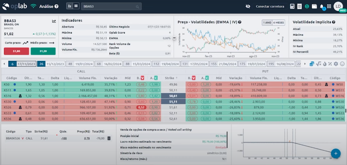 Eu poderia montar um lançamento coberto para o strike de R$ 51.61, recebendo uma taxa de R$ 0,52 por opção.