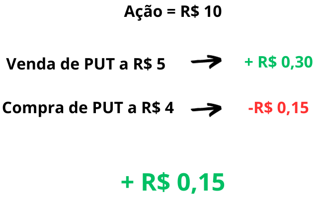 A imagem mostra como gerar renda e reduzir o preço de uma ação com venda e compra de PUT.