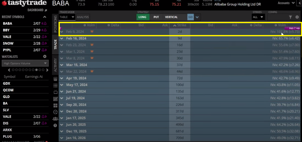 Veja o que acontece com a volatilidade do BABA (Alibaba) perto do balanço.