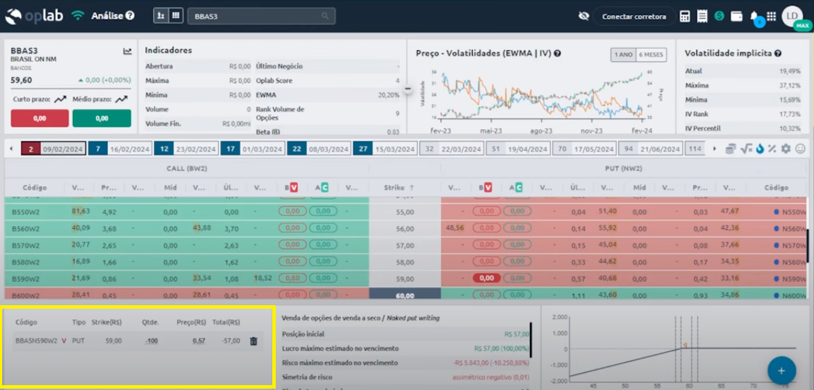 Se fossemos montar uma venda de PUT com essa opção, conseguiríamos uma taxa de 0,96% para dois dias (R$ 0,57/R$ 59).