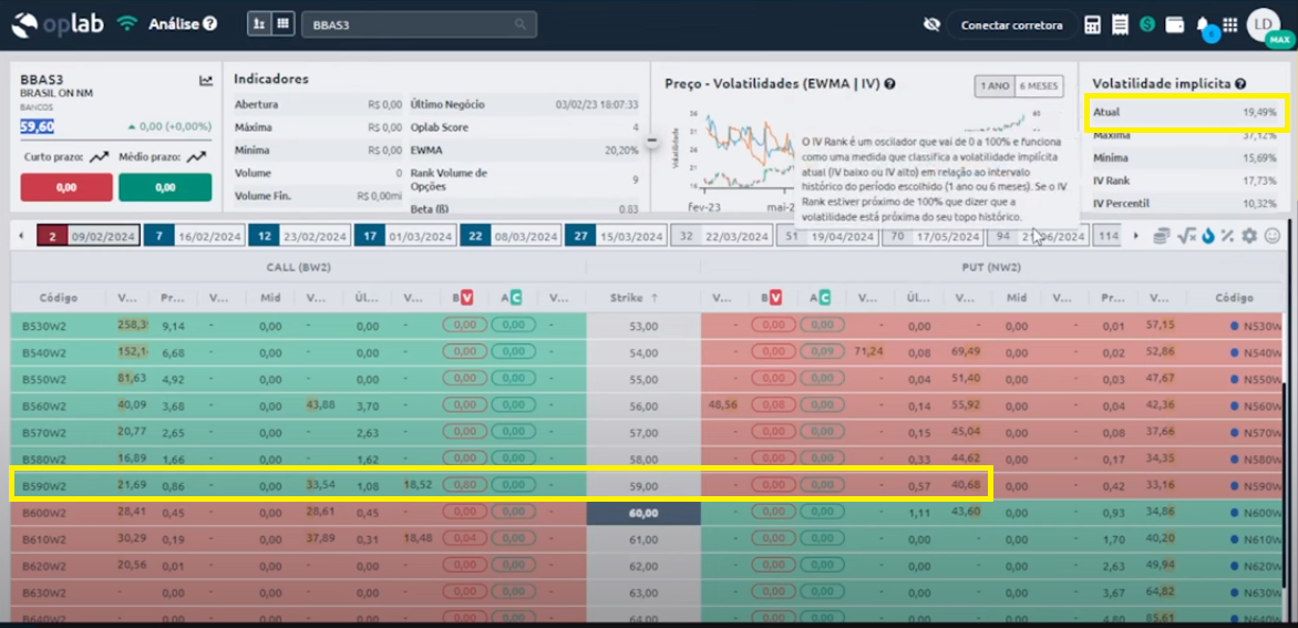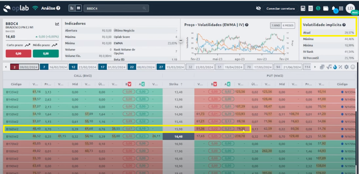 Na imagem abaixo conseguimos ver como a volatilidade do BBDC4 aumentou próximo ao balanço do Bradesco, chegando a 79,35% para uma opção ATM.