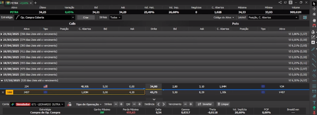 Vamos usar como exemplo uma opção longa da PETR4, para 520 dias.