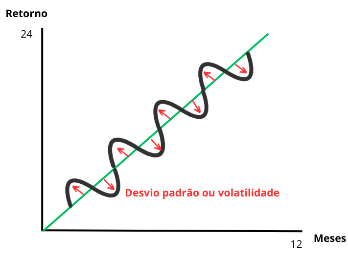 Dessa forma, se um determinado ativo possui um desvio padrão de 3%, significa que em alguns períodos ele oscila 3% para baixo (ou seja, -1%) ou para cima (5%).