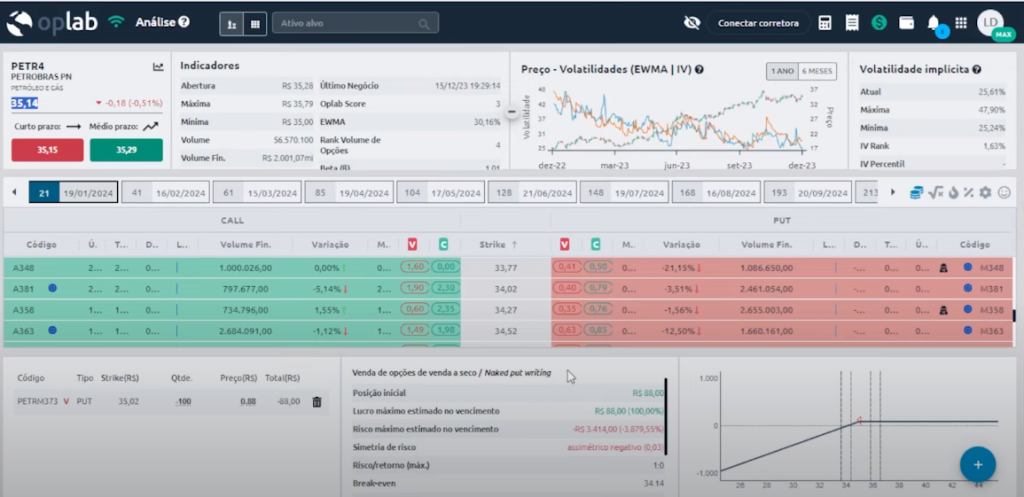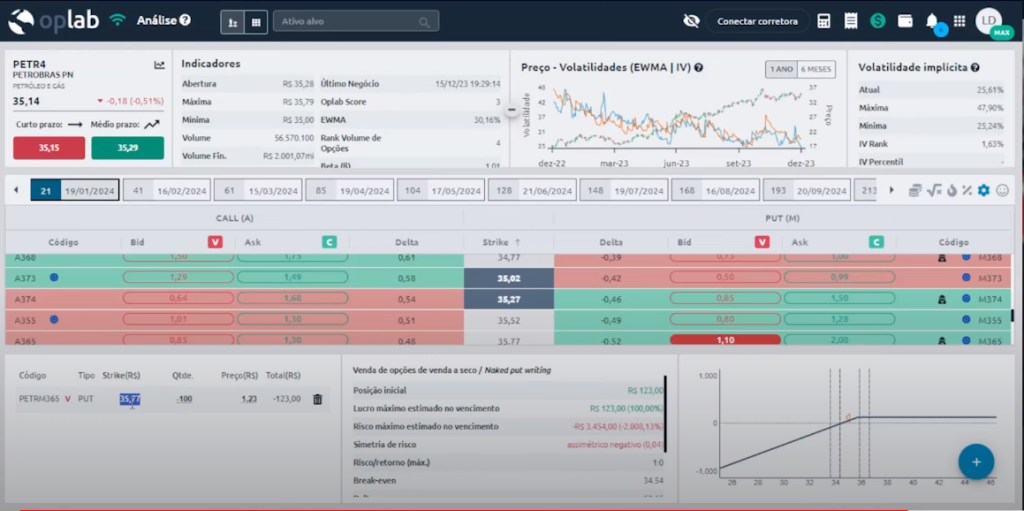 No caso da PETR4, por exemplo, pegaríamos uma opção com strike a R$35,77.
